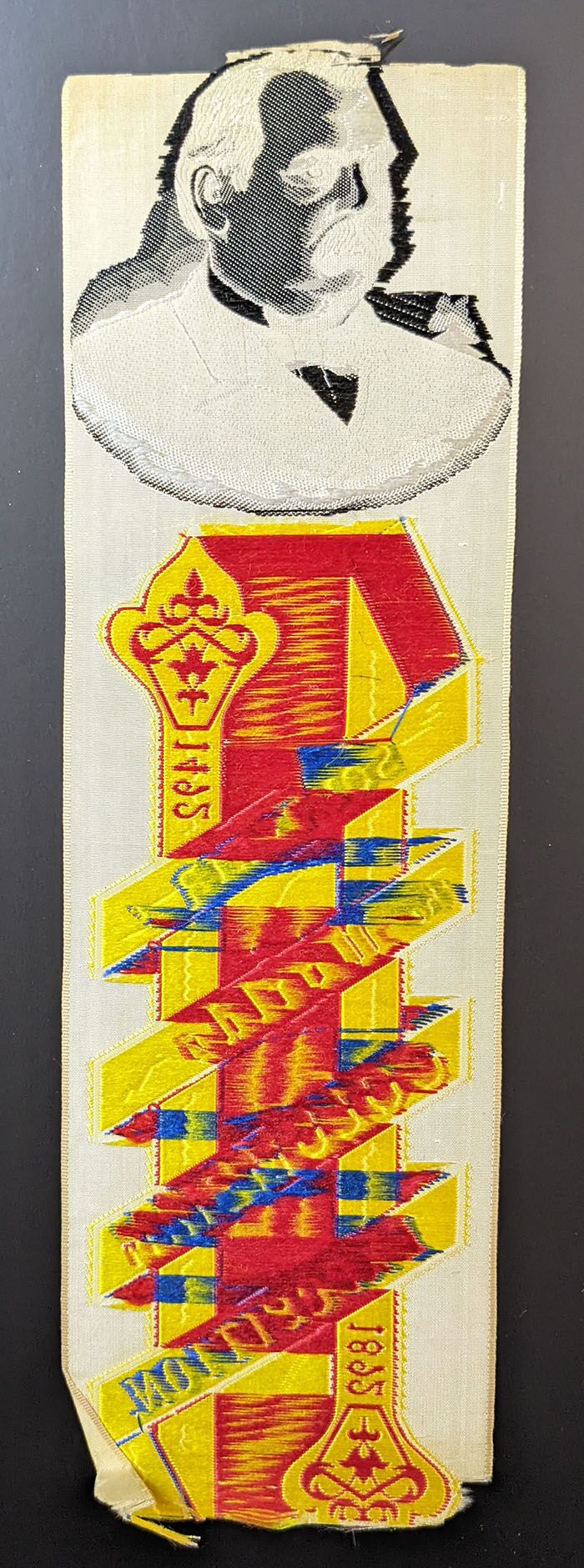 Original souvenir silk ribbon, rare variety, with damages and use as shown. Very vibrant colors. Unknown maker.