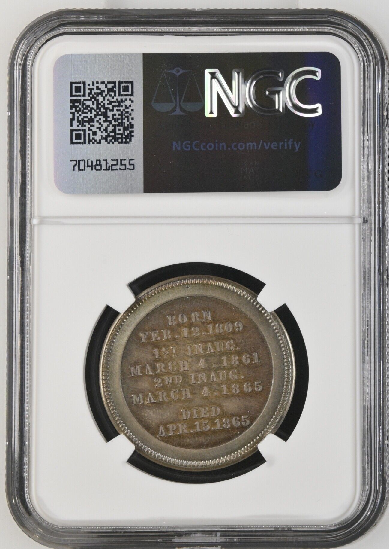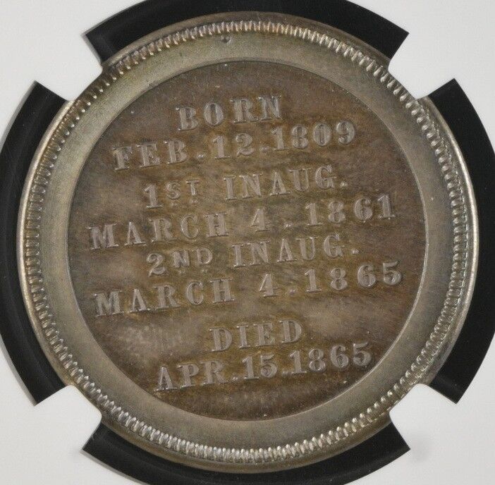 Reverse: “Born Feb. 12. 1809 1st Inaug. March 4. 1861 2nd Inaug. March 4. 1865 Died Apr. 15. 1865”